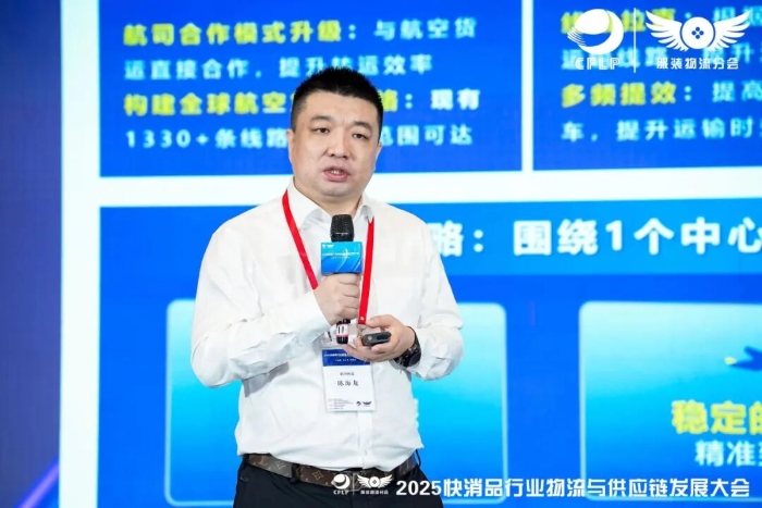 德邦快递集团副总裁、德邦快递销售部总裁陈海龙以《到仓、到店、到个人:德邦快递助力快消行业全链畅通》为题进行演讲。首先他介绍了德邦快递是一家专业、领先的第三方综合性物流供应商。然后他谈到了目前快消品行业的现状及趋势,介绍到德邦已经推出针对性的解决方案。最后他通过结合实际快消品品牌案例,谈到德邦可以为企业提供工厂到全国RDC,配送服务全渠道、上万个末端收货点,以及端到端一体化物流服务。